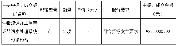 廣東業(yè)信采購(gòu)招標(biāo)有限公司受 陽(yáng)江市陽(yáng)東區(qū)食品集團(tuán)塘坪有限公司 的委托,于2024年8月9日就 生豬流通加工屠宰環(huán)節(jié)污水處理系統(tǒng)設(shè)施設(shè)備建設(shè)項(xiàng)目 (項(xiàng)目編號(hào):YXCG-20240719)采用公開招標(biāo)方式進(jìn)行采購(gòu)。現(xiàn)就本次采購(gòu)的中標(biāo)結(jié)果公告如下: