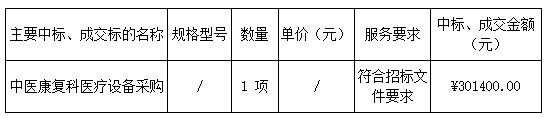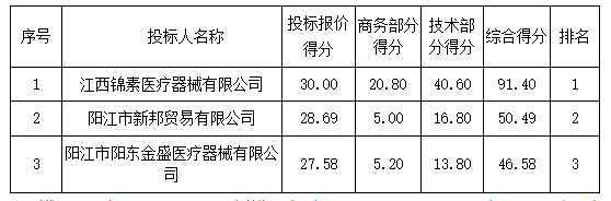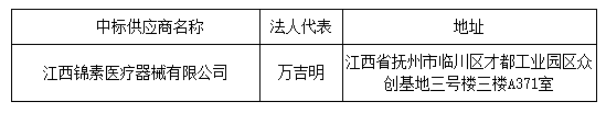 投標(biāo)結(jié)果:最終評(píng)標(biāo)委員會(huì)一致推薦 江西錦素醫(yī)療器械有限公司 為中標(biāo)單位,中標(biāo)金額為人民幣 301400.00 元,(大寫金額: 叁拾萬零壹仟肆佰元整 )。