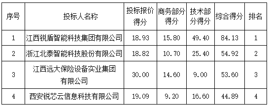 投標(biāo)結(jié)果:最終評標(biāo)委員會一致推薦 江西銳盾智能科技集團(tuán)有限公司 為中標(biāo)單位,中標(biāo)金額為人民幣 473586.00 元,(大寫金額: 肆拾柒萬叁仟伍佰捌拾陸元整 )。