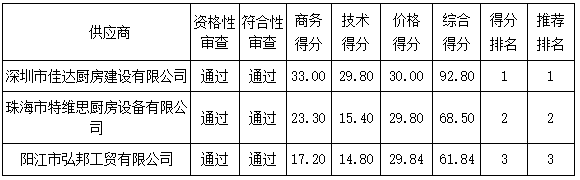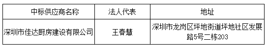 投標結果:最終評標委員會一致推薦 深圳市佳達廚房建設有限公司 為中標單位,中標金額為人民幣 216800.00 元,(大寫金額: 貳拾壹萬陸仟捌佰元整 )。