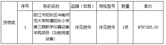 二、采購(gòu)項(xiàng)目名稱:陽(yáng)江市陽(yáng)東區(qū)華南師范大學(xué)附屬陽(yáng)東小學(xué)第三期教學(xué)儀器設(shè)備采購(gòu)項(xiàng)目(功能場(chǎng)室設(shè)備)