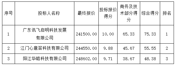 磋商結(jié)果:最終磋商小組一致推薦 廣東訊飛啟明科技發(fā)展有限公司 為成交單位,成交金額為人民幣 241500.00元,(大寫金額: 貳拾肆萬(wàn)壹仟伍佰元整 )。