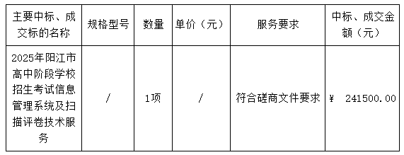 廣東業(yè)信采購(gòu)招標(biāo)有限公司受 陽(yáng)江市教育局 的委托,于2025年3月3日就 2025年陽(yáng)江市高中階段學(xué)校招生考試信息管理系統(tǒng)及掃描評(píng)卷技術(shù)服務(wù)項(xiàng)目(項(xiàng)目編號(hào):YXCG-20250217)采用競(jìng)爭(zhēng)性磋商方式進(jìn)行采購(gòu)?,F(xiàn)就本次采購(gòu)的成交結(jié)果公告如下: