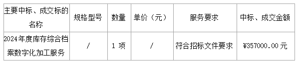 廣東業(yè)信采購招標有限公司受 陽江市江城區(qū)人民檢察院 的委托,于2024年6月25日就 陽江市江城區(qū)人民檢察院2024年度庫存綜合檔案數(shù)字化加工服務項目(項目編號:YXCG-20240516)采用公開招標方式進行采購。現(xiàn)就本次采購的中標結果公告如下: