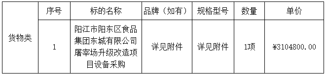 二、采購項(xiàng)目名稱:陽江市陽東區(qū)食品集團(tuán)東城有限公司屠宰場升級(jí)改造項(xiàng)目設(shè)備采購