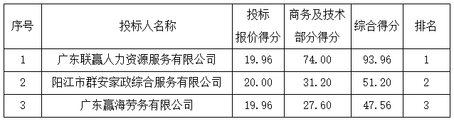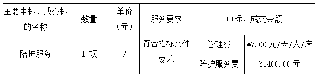 投標(biāo)結(jié)果:最終評(píng)標(biāo)委員會(huì)一致推薦 廣東聯(lián)贏人力資源服務(wù)有限公司 為預(yù)中標(biāo)單位,中標(biāo)的投標(biāo)管理費(fèi)為人民幣 7.00 元/天/人/床,陪護(hù)服務(wù)費(fèi)為人民幣 1400.00 元。
