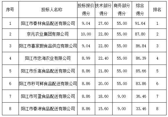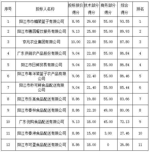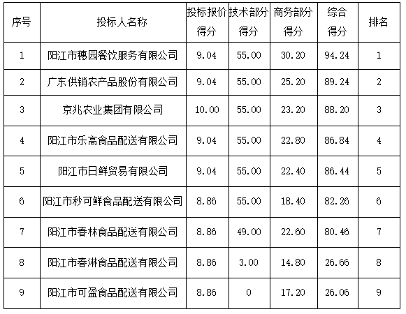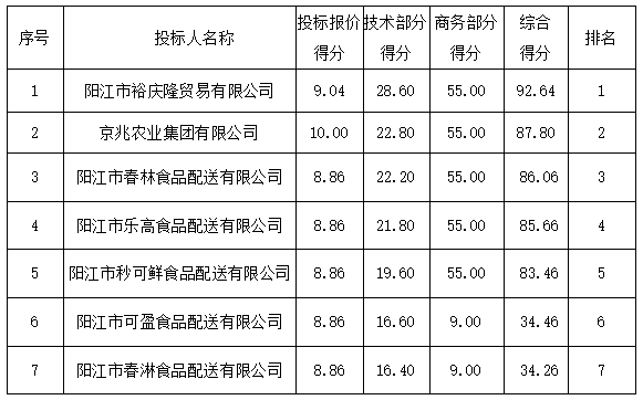 2.陽(yáng)江市盛泰食品配送有限公司:投標(biāo)文件未提供有效的營(yíng)業(yè)執(zhí)照(或事業(yè)法人登記證或身份證等相關(guān)證明) 副本復(fù)印件,未按招標(biāo)文件要求提供依法繳納社會(huì)保障資金的良好記錄,資格性審查不通過(guò)。