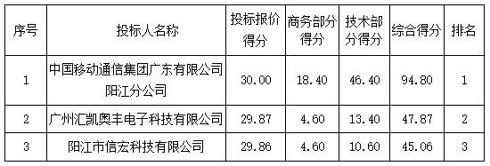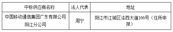 投標結(jié)果:最終評標委員會一致推薦 中國移動通信集團廣東有限公司陽江分公司 為中標單位,中標金額為人民幣 938571.00 元,(大寫金額: 玖拾叁萬捌仟伍佰柒拾壹元整 )。