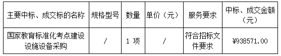 廣東業(yè)信采購招標有限公司受 陽春市第三中學(xué) 的委托,于2024年12月24日就 陽春市第三中學(xué)國家教育標準化考點建設(shè)設(shè)施設(shè)備采購項目(項目編號:YXCG-20241121)采用公開招標方式進行采購?,F(xiàn)就本次采購的中標結(jié)果公告如下: