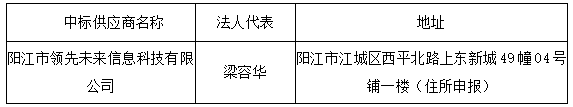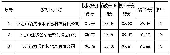 投標(biāo)結(jié)果:最終評(píng)標(biāo)委員會(huì)一致推薦 陽江市領(lǐng)先未來信息科技有限公司 為中標(biāo)單位,中標(biāo)金額為人民幣 687425.00 元,(大寫金額: 陸拾捌萬柒仟肆佰貳拾伍元整 )。