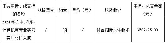 廣東業(yè)信采購(gòu)招標(biāo)有限公司受 陽江技師學(xué)院 的委托,于2024年8月6日就 陽江技師學(xué)院2024年機(jī)電、汽車、計(jì)算機(jī)等專業(yè)實(shí)習(xí)實(shí)訓(xùn)材料采購(gòu)項(xiàng)目(項(xiàng)目編號(hào):YXCG-20240607)采用公開招標(biāo)方式進(jìn)行采購(gòu)?,F(xiàn)就本次采購(gòu)的中標(biāo)結(jié)果公告如下: