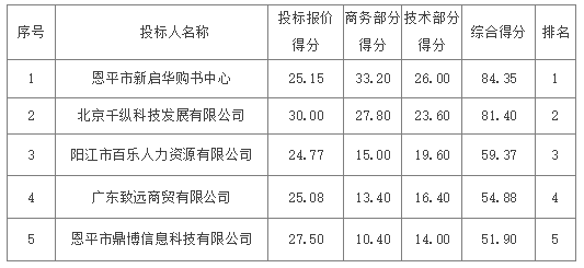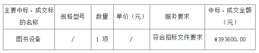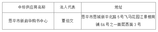 投標(biāo)結(jié)果:最終評(píng)標(biāo)委員會(huì)一致推薦 恩平市新啟華購(gòu)書中心 為中標(biāo)單位,中標(biāo)金額為人民幣 393600.00 元,(大寫金額: 叁拾玖萬(wàn)叁仟陸佰元整 )。