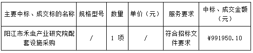 廣東業(yè)信采購招標有限公司受 陽江市江城區(qū)鼉城食品有限公司 的委托,于2025年1月23日就 陽江市禾蟲產(chǎn)業(yè)研究院配套設施采購項目 (項目編號:YXCG-20241230)采用公開招標方式進行采購?,F(xiàn)就本次采購的中標結果公告如下: