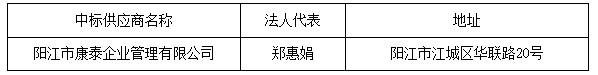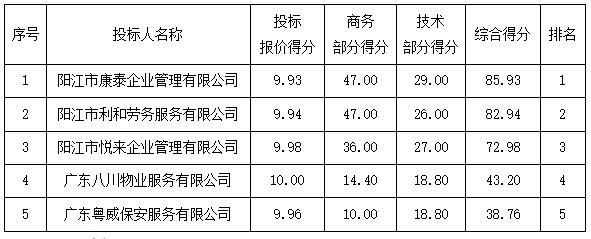 投標(biāo)結(jié)果:最終評標(biāo)委員會一致推薦 陽江市康泰企業(yè)管理有限公司 為預(yù)中標(biāo)單位,中標(biāo)折扣率為 99.50% 。