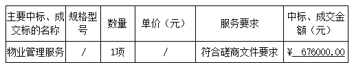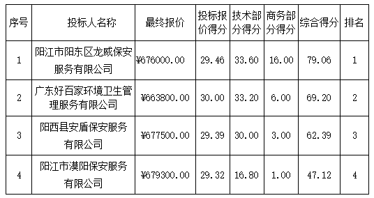 磋商結(jié)果:最終磋商小組一致推薦 陽江市陽東區(qū)龍威保安服務(wù)有限公司 為成交單位,成交金額為人民幣 676000.00元,(大寫金額: 陸拾柒萬陸仟元整 )。