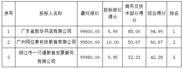 磋商結(jié)果:最終磋商小組一致推薦 廣東省新華書店有限公司 為成交單位,成交金額為人民幣 99600.00元,(大寫金額: 玖萬玖仟陸佰元整 )。