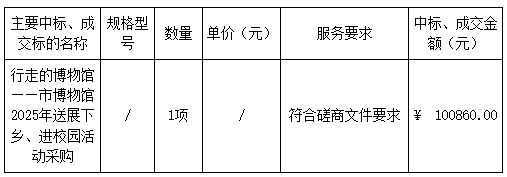 廣東業(yè)信采購(gòu)招標(biāo)有限公司受 陽(yáng)江市博物館 的委托,于2025年4月7日就 行走的博物館——市博物館2025年送展下鄉(xiāng)、進(jìn)校園活動(dòng)采購(gòu)項(xiàng)目(項(xiàng)目編號(hào):YXCG-20250313)采用競(jìng)爭(zhēng)性磋商方式進(jìn)行采購(gòu)?,F(xiàn)就本次采購(gòu)的成交結(jié)果公告如下: