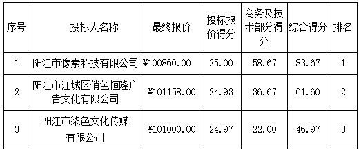 磋商結(jié)果:最終磋商小組一致推薦 陽(yáng)江市像素科技有限公司 為成交單位,成交金額為人民幣 100860.00元,(大寫金額:壹拾萬(wàn)零捌佰陸拾元整 )。
