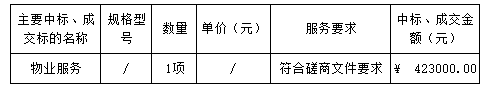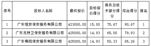 磋商結(jié)果:最終磋商小組一致推薦 廣東恒安保安服務(wù)有限公司 為成交單位,成交金額為人民幣 423000.00元,(大寫金額: 肆拾貳萬叁仟元整 )。