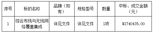 比選結(jié)果:最終比選小組一致推薦 中移建設(shè)有限公司廣東分公司 為成交單位,成交金額為人民幣 2740435.00元,(大寫金額: 貳佰柒拾肆萬零肆佰叁拾伍元整 )。