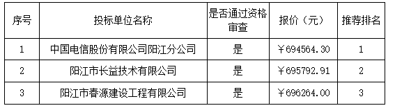 報價結(jié)果:最終詢價小組一致推薦 中國電信股份有限公司陽江分公司 為成交單位,成交金額為人民幣 694564.30 元(大寫金額: 陸拾玖萬肆仟伍佰陸拾肆元叁角整 )。