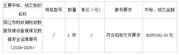 廣東業(yè)信采購招標(biāo)有限公司受 陽江市財政局 的委托,于2024年6月5日就 陽江市財政局財政數(shù)據(jù)存儲設(shè)備維保及數(shù)據(jù)安全運維服務(wù)(2024-2026)項目(項目編號:YXCG-20240513)采用公開招標(biāo)方式進行采購?,F(xiàn)就本次采購的中標(biāo)結(jié)果公告如下: