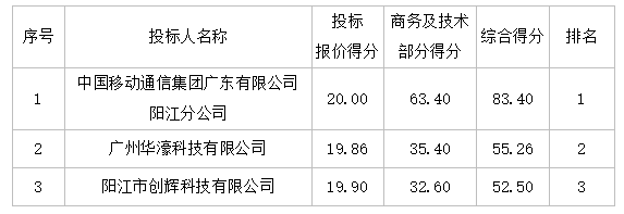 投標(biāo)結(jié)果:最終評標(biāo)委員會一致推薦 中國移動通信集團廣東有限公司陽江分公司 為預(yù)中標(biāo)單位,中標(biāo)金額為人民幣 287000.00 元,(大寫金額: 貳拾捌萬柒仟元整 ) 。