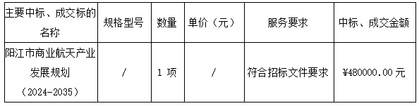 廣東業(yè)信采購(gòu)招標(biāo)有限公司受 陽江市工業(yè)和信息化局 的委托,于2024年7月26日就 陽江市商業(yè)航天產(chǎn)業(yè)發(fā)展規(guī)劃(2024-2035)項(xiàng)目(項(xiàng)目編號(hào):YXCG-20240620)采用公開招標(biāo)方式進(jìn)行采購(gòu)。現(xiàn)就本次采購(gòu)的中標(biāo)結(jié)果公告如下: