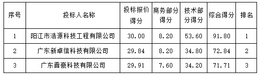 投標(biāo)結(jié)果:最終評(píng)標(biāo)委員會(huì)一致推薦 陽(yáng)江市浩源科技工程有限公司 為中標(biāo)單位,中標(biāo)金額為人民幣 393952.00 元,(大寫金額: 叁拾玖萬(wàn)叁仟玖佰伍拾貳元整 )。