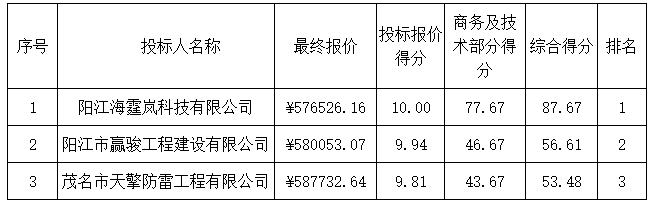 磋商結(jié)果:最終磋商小組一致推薦 陽江海霆嵐科技有限公司 為成交單位,成交金額為人民幣 576526.16元,(大寫金額: 伍拾柒萬陸仟伍佰貳拾陸元壹角陸分 )。