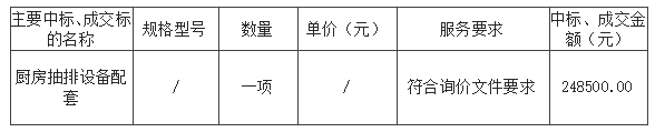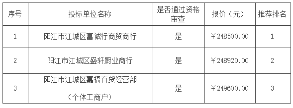 報價結(jié)果:最終詢價小組一致推薦 陽江市江城區(qū)富誠行商貿(mào)商行 為成交單位,成交金額為人民幣 248500.00 元(大寫金額: 貳拾肆萬捌仟伍佰元整 )。
