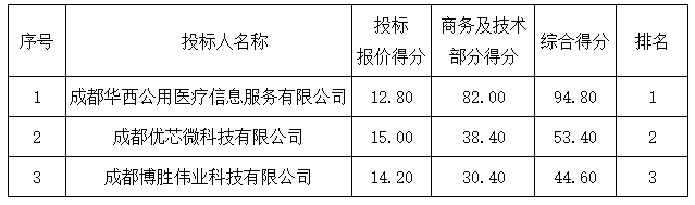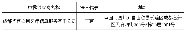 投標(biāo)結(jié)果:最終評標(biāo)委員會一致推薦 成都華西公用醫(yī)療信息服務(wù)有限公司 為預(yù)中標(biāo)單位,中標(biāo)金額為人民幣 269500.00 元,(大寫金額: 貳拾陸萬玖仟伍佰元整 ) 。