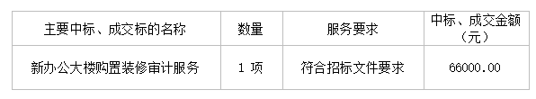 投標結(jié)果:最終評標委員會一致推薦 中天運會計師事務(wù)所(特殊普通合伙)廣東分所 為預(yù)中標單位,中標金額為人民幣 66000.00 元,(大寫金額: 陸萬陸仟元整 ) 。