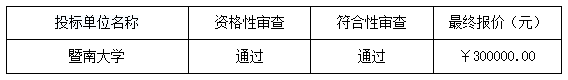 談判結(jié)果:最終單一來(lái)源小組一致推薦 暨南大學(xué) 為成交單位,成交金額為人民幣300000.00 元,(大寫金額: 叁拾萬(wàn)元整 )。